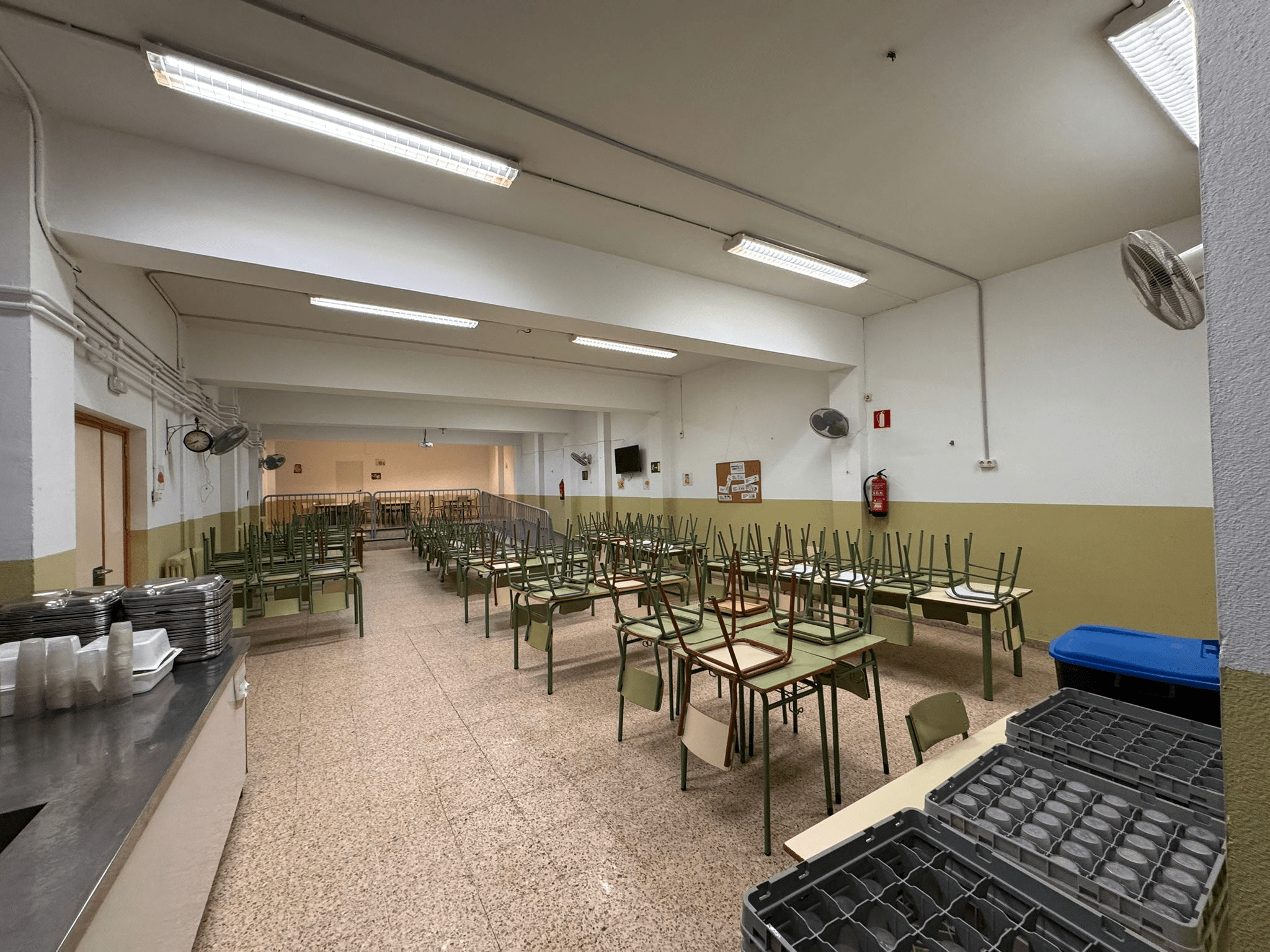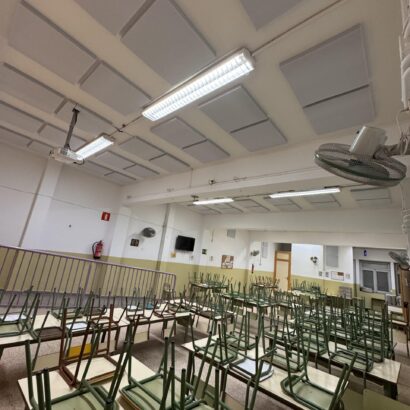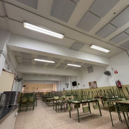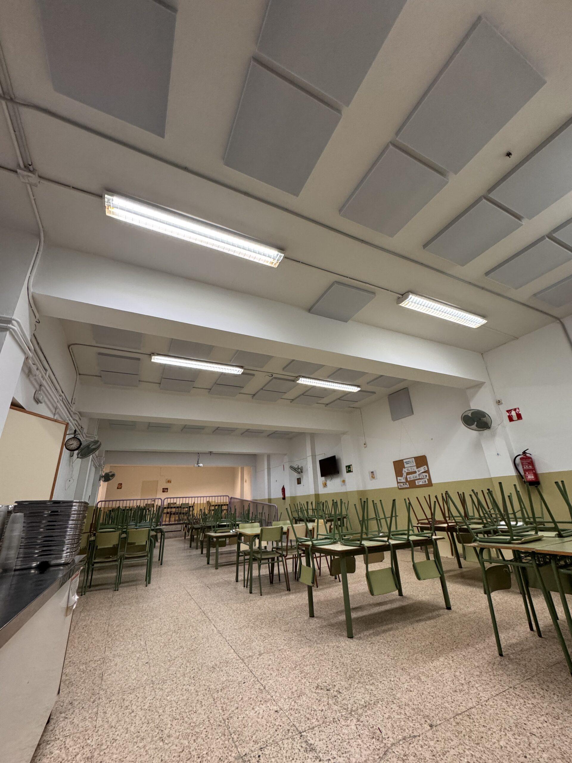 Los comedores escolares suelen ser zonas amplias y con superficies duras que reflejan el sonido. Esto provoca que las conversaciones, los movimientos y el ruido general se acumulen, generando un ambiente acústico muy incómodo. En este caso, la reverberación era tan alta que el espacio se había convertido en una estancia prácticamente insoportable para alumnos y personal del centro.